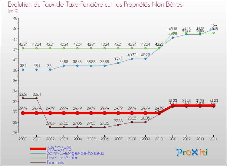 A Arcomps, le taux de taxe foncière sur le non bâti a ainsi augmenté de 4.83 % entre 2000 et 2014.