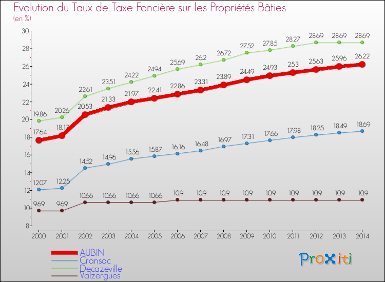 Pendant la même période, les communes françaises similaires à Aubin, ont vu leur taux de taxe foncière sur le bâti augmenter de 21.97 % en moyenne entre 2000 et 2014.