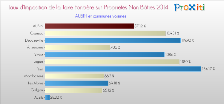 Vous trouverez ci-dessous des graphiques qui vous permettent de situer le taux de la taxe foncière sur le non bâti de Aubin par rapport aux communes voisines.