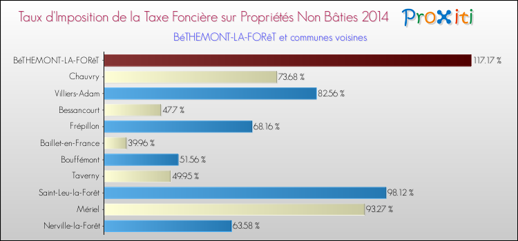 En 2014, le taux de la taxe foncière sur le non bâti vôté par le conseil municipal de Béthemont-la-Forêt était de : 117.17 %.