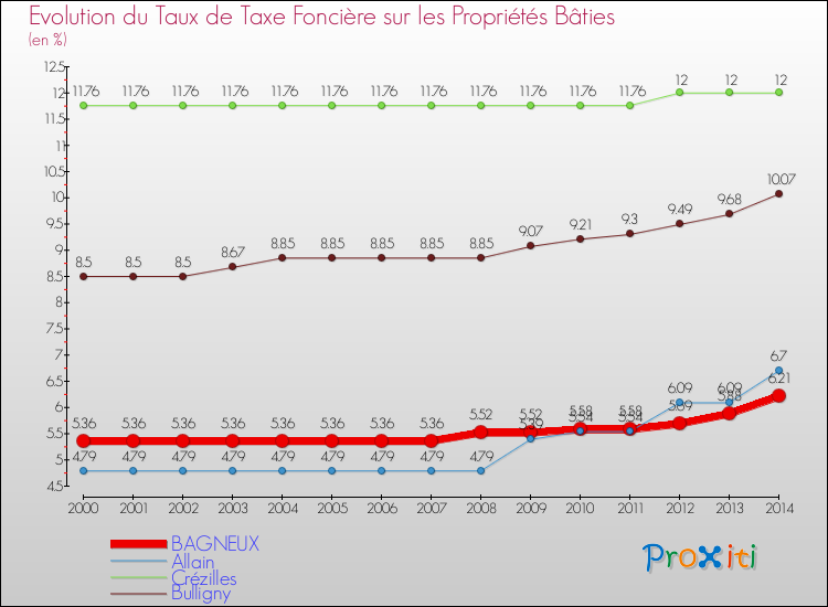 En 2014, le taux de la taxe foncière sur le bâti vôté par le conseil municipal de Bagneux était de : 6.21 %.