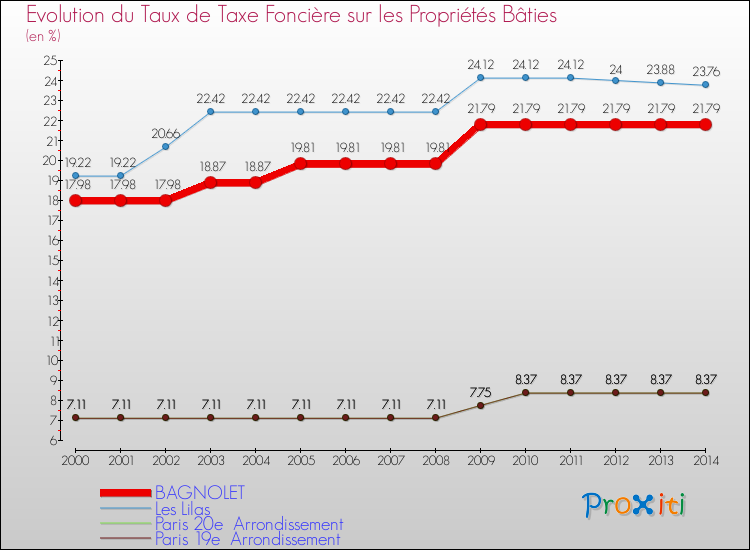 A Bagnolet, le taux de taxe foncière sur le bâti a donc augmenté de 21.19 % entre 2000 et 2014.