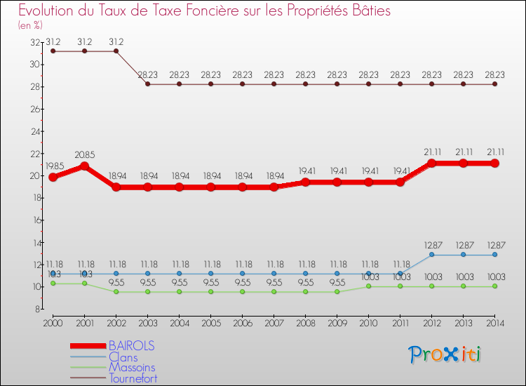 Pendant la même période, les communes françaises similaires à Bairols, ont vu leur taux de taxe foncière sur le bâti augmenter de 21.52 % en moyenne entre 2000 et 2014.
