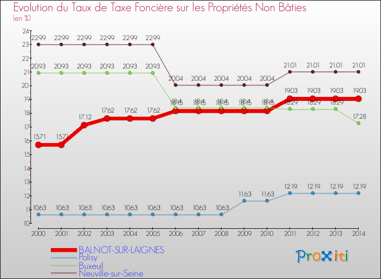 Pendant la même période, les communes françaises similaires à Balnot-sur-Laignes, ont vu leur taux de taxe foncière sur le non bâti baisser de 19.2 % en moyenne entre 2000 et 2014.