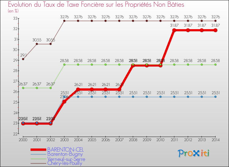 Pendant la même période, les communes françaises similaires à Barenton-Cel, ont vu leur taux de taxe foncière sur le non bâti augmenter de 41.31 % en moyenne entre 2000 et 2014.