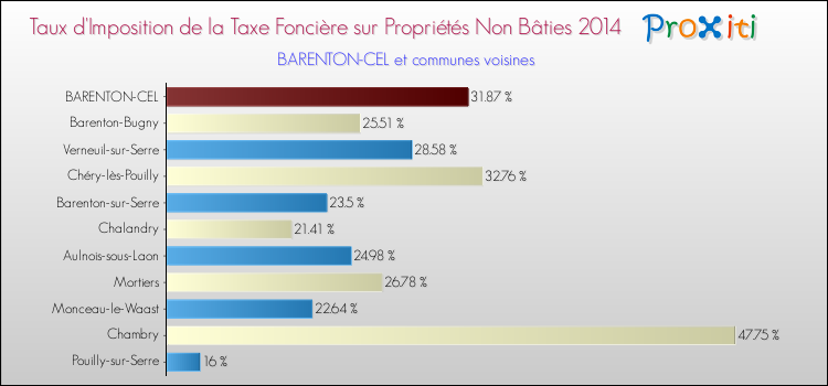 En 2014, le taux de la taxe foncière sur le non bâti vôté par le conseil municipal de Barenton-Cel était de : 31.87 %.