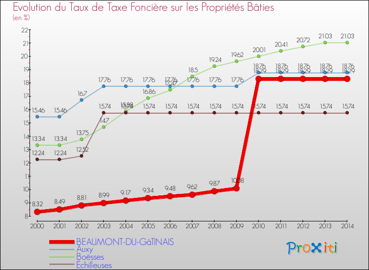 Pendant la même période, les communes françaises similaires à Beaumont-du-Gâtinais, ont vu leur taux de taxe foncière sur le bâti augmenter de 27.2 % en moyenne entre 2000 et 2014.