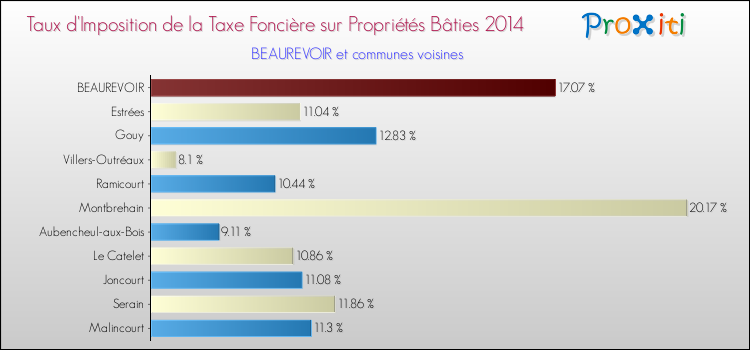 En 2014, le taux de la taxe foncière sur le bâti vôté par le conseil municipal de Beaurevoir était de : 17.07 %.