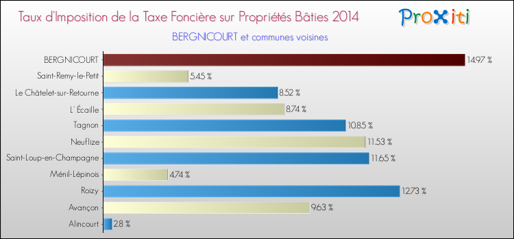 En 2014, le taux de la taxe foncière sur le bâti vôté par le conseil municipal de Bergnicourt était de : 14.97 %.