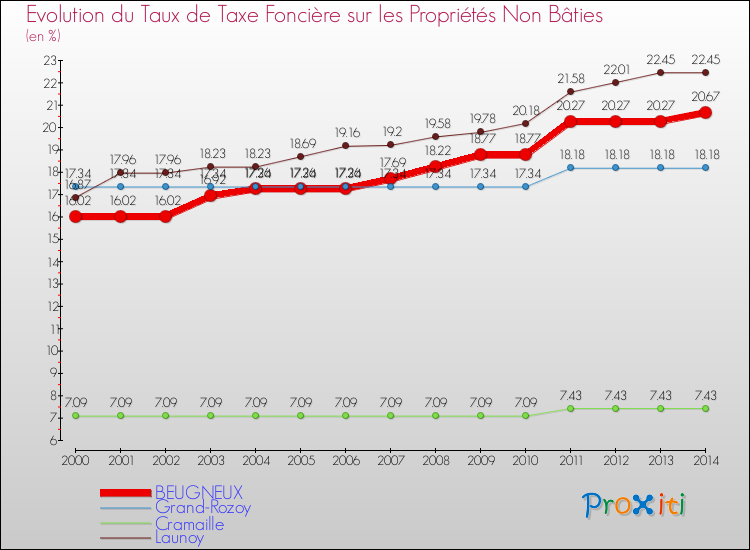 Pendant la même période, les communes françaises similaires à Beugneux, ont vu leur taux de taxe foncière sur le non bâti baisser de 4.47 % en moyenne entre 2000 et 2014.