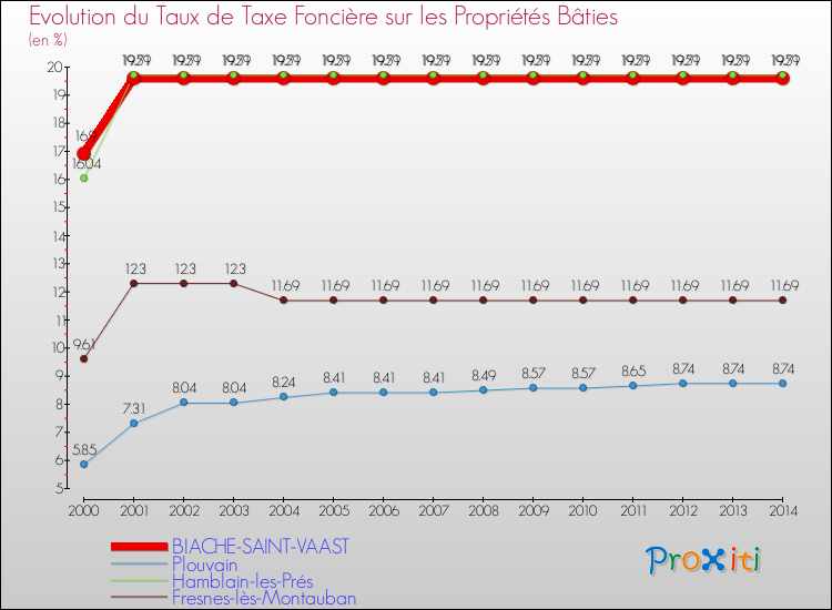 En 2014, le taux de la taxe foncière sur le bâti vôté par le conseil municipal de Biache-Saint-Vaast était de : 19.59 %.