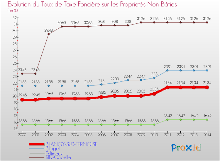 Pendant la même période, les communes françaises similaires à Blangy-sur-Ternoise, ont vu leur taux de taxe foncière sur le non bâti augmenter de 24.79 % en moyenne entre 2000 et 2014.