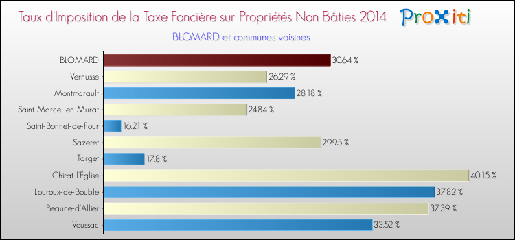 En 2014, le taux de la taxe foncière sur le non bâti vôté par le conseil municipal de Blomard était de : 30.64 %.