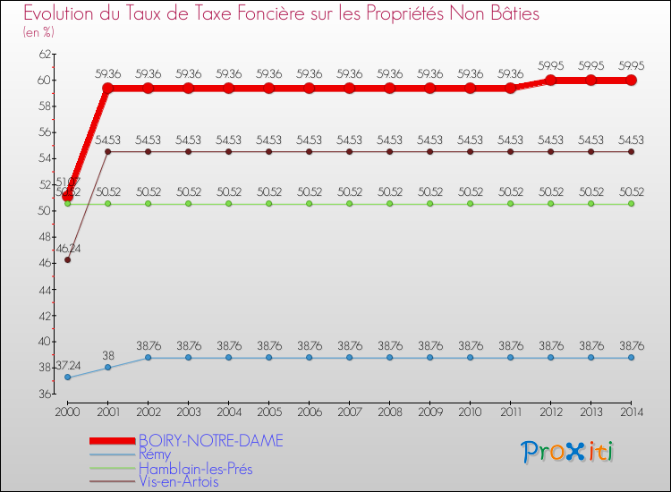 Pendant la même période, les communes françaises similaires à Boiry-Notre-Dame, ont vu leur taux de taxe foncière sur le non bâti augmenter de 27.3 % en moyenne entre 2000 et 2014.