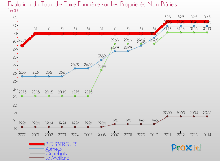 En 2014, le taux de la taxe foncière sur le non bâti vôté par le conseil municipal de Boisbergues était de : 32.5 %.