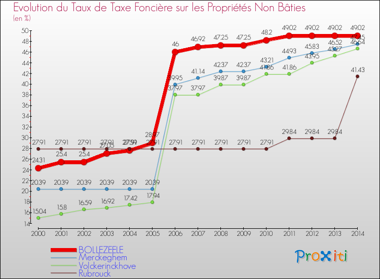 A Bollezeele, le taux de taxe foncière sur le non bâti a ainsi augmenté de 101.65 % entre 2000 et 2014.