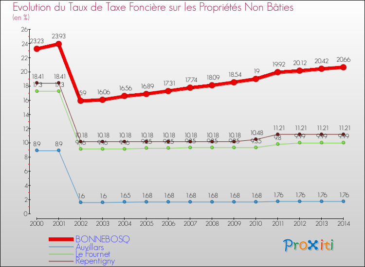 Pendant la même période, les communes françaises similaires à Bonnebosq, ont vu leur taux de taxe foncière sur le non bâti baisser de 10.08 % en moyenne entre 2000 et 2014.