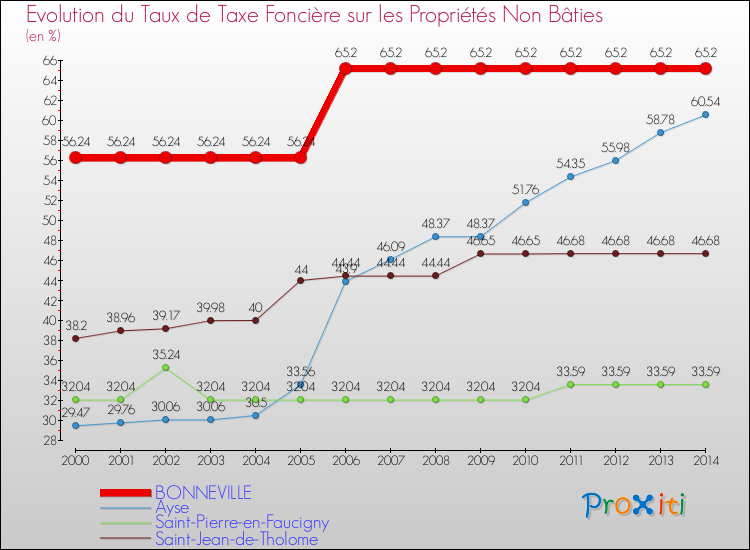 A Bonneville, le taux de taxe foncière sur le non bâti a ainsi augmenté de 15.93 % entre 2000 et 2014.