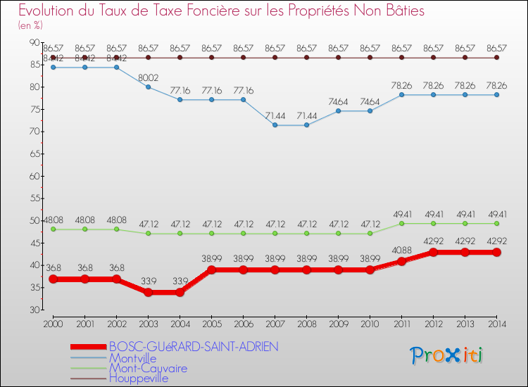 A Bosc-Guérard-Saint-Adrien, le taux de taxe foncière sur le non bâti a ainsi augmenté de 16.63 % entre 2000 et 2014.