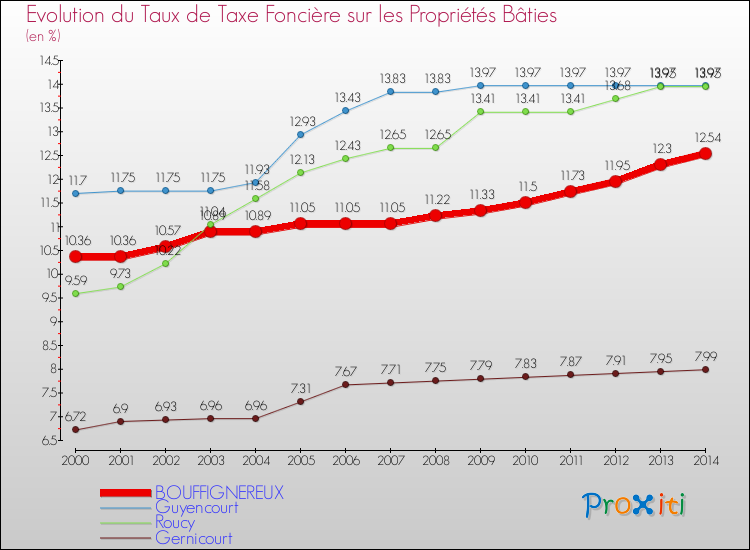 Pendant la même période, les communes françaises similaires à Bouffignereux, ont vu leur taux de taxe foncière sur le bâti augmenter de 7.04 % en moyenne entre 2000 et 2014.