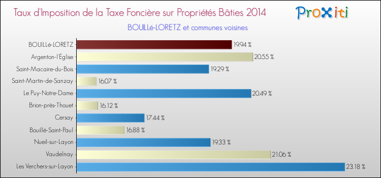 En 2014, le taux de la taxe foncière sur le bâti vôté par le conseil municipal de Bouillé-Loretz était de : 19.94 %.