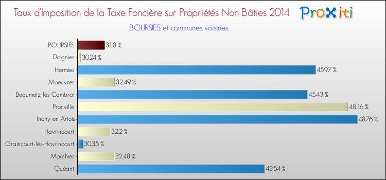 En 2014, le taux de la taxe foncière sur le non bâti vôté par le conseil municipal de Boursies était de : 31.8 %.