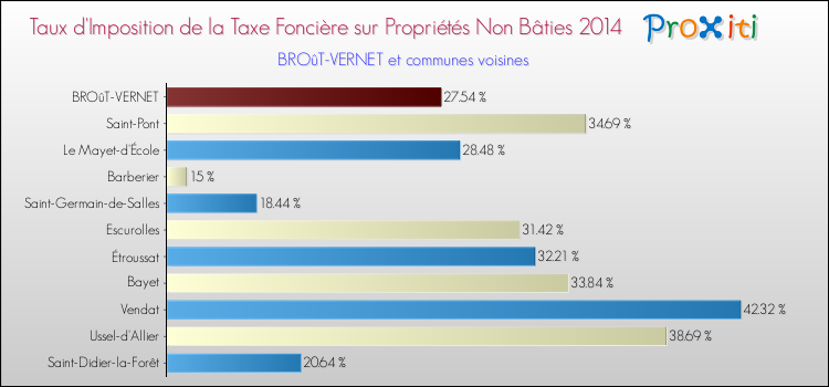 En 2014, le taux de la taxe foncière sur le non bâti vôté par le conseil municipal de Broût-Vernet était de : 27.54 %.