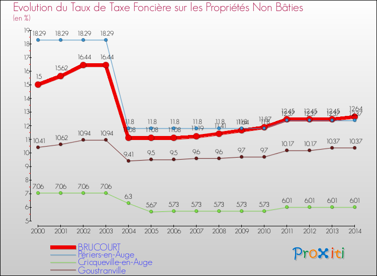 Pendant la même période, les communes françaises similaires à Brucourt, ont vu leur taux de taxe foncière sur le non bâti baisser de 19.2 % en moyenne entre 2000 et 2014.
