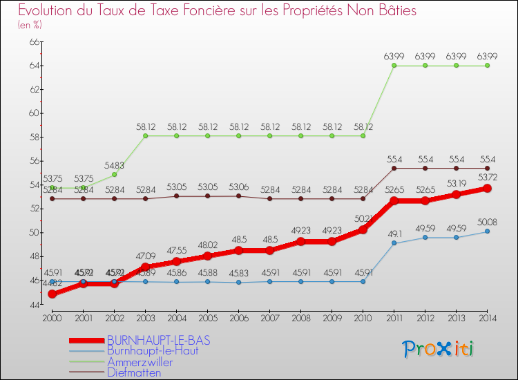 A Burnhaupt-le-Bas, le taux de taxe foncière sur le non bâti a ainsi augmenté de 19.86 % entre 2000 et 2014.