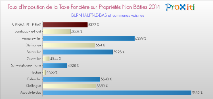 En 2014, le taux de la taxe foncière sur le non bâti vôté par le conseil municipal de Burnhaupt-le-Bas était de : 53.72 %.