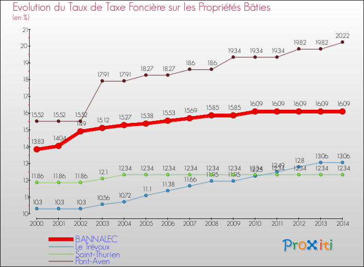 A Bannalec, le taux de taxe foncière sur le bâti a donc augmenté de 16.34 % entre 2000 et 2014.