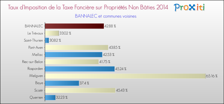 En 2014, le taux de la taxe foncière sur le non bâti vôté par le conseil municipal de Bannalec était de : 42.88 %.
