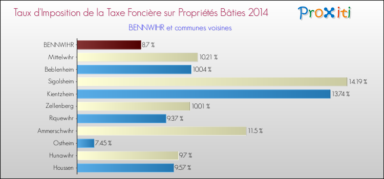 En 2014, le taux de la taxe foncière sur le bâti vôté par le conseil municipal de Bennwihr était de : 8.7 %.