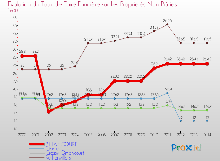 En 2014, le taux de la taxe foncière sur le non bâti vôté par le conseil municipal de Billancourt était de : 26.42 %.