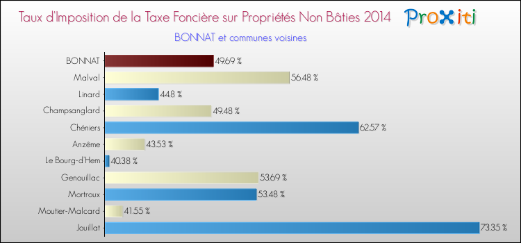 En 2014, le taux de la taxe foncière sur le non bâti vôté par le conseil municipal de Bonnat était de : 49.69 %.