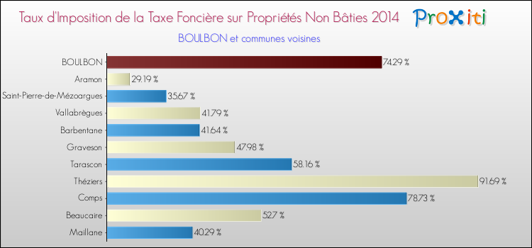 En 2014, le taux de la taxe foncière sur le non bâti vôté par le conseil municipal de Boulbon était de : 74.29 %.