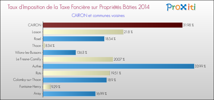 En 2014, le taux de la taxe foncière sur le bâti vôté par le conseil municipal de Cairon était de : 31.98 %.