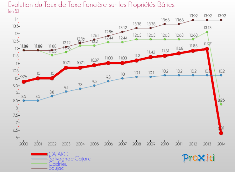 Pendant la même période, les communes françaises similaires à Cajarc, ont vu leur taux de taxe foncière sur le bâti augmenter de 21.75 % en moyenne entre 2000 et 2014.