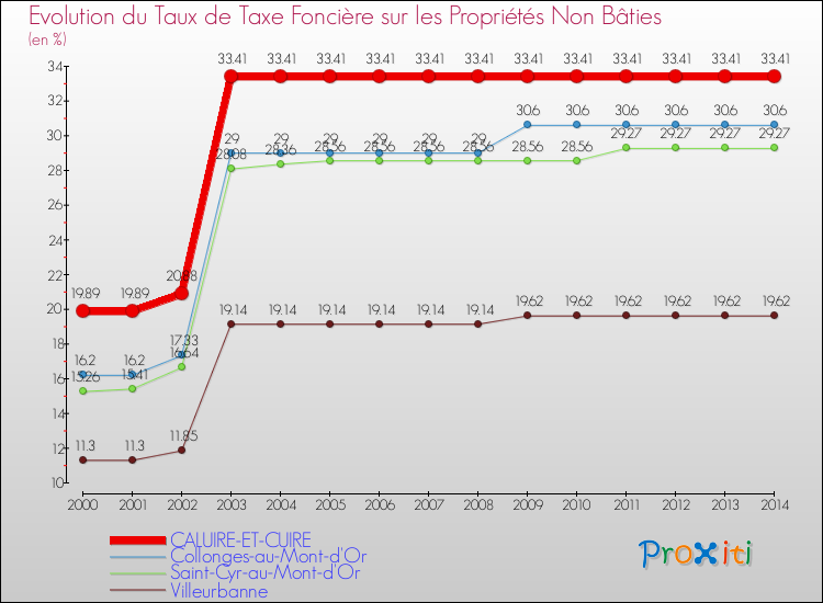 Pendant la même période, les communes françaises similaires à Caluire-et-Cuire, ont vu leur taux de taxe foncière sur le non bâti augmenter de 39.62 % en moyenne entre 2000 et 2014.
