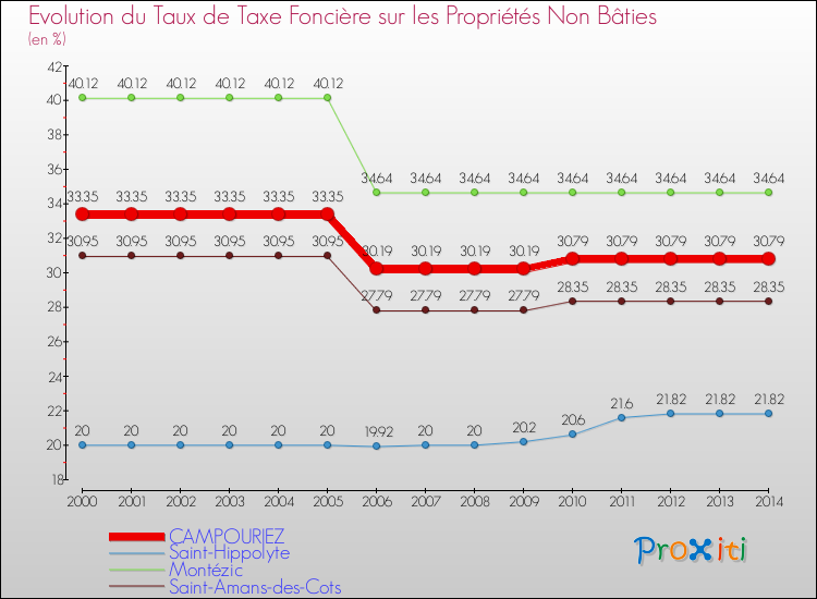 A Campouriez, le taux de taxe foncière sur le non bâti a ainsi baissé de 7.68 % entre 2000 et 2014.