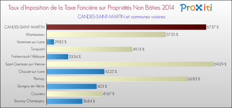 En 2014, le taux de la taxe foncière sur le non bâti vôté par le conseil municipal de Candes-Saint-Martin était de : 67.37 %.