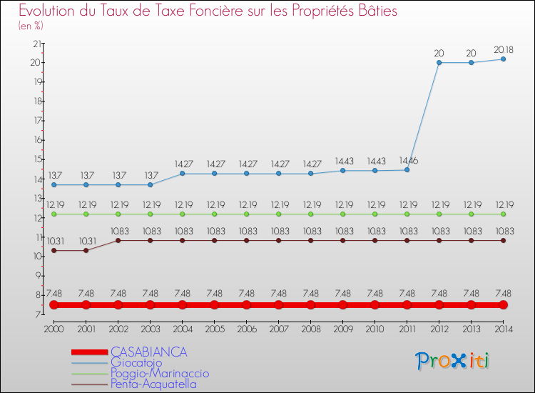 A Casabianca, le taux de taxe foncière sur le bâti a donc augmenté de 0 % entre 2000 et 2014.