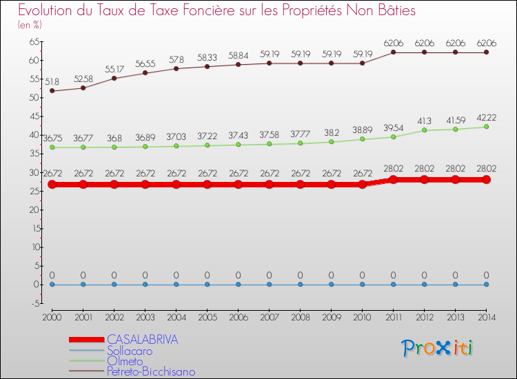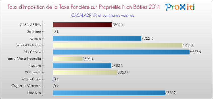 En 2014, le taux de la taxe foncière sur le non bâti vôté par le conseil municipal de Casalabriva était de : 28.02 %.