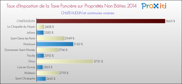 En 2014, le taux de la taxe foncière sur le non bâti vôté par le conseil municipal de Châteaudun était de : 56.65 %.