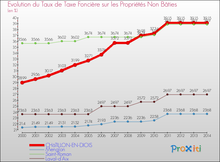 Pendant la même période, les communes françaises similaires à Châtillon-en-Diois, ont vu leur taux de taxe foncière sur le non bâti augmenter de 9.43 % en moyenne entre 2000 et 2014.