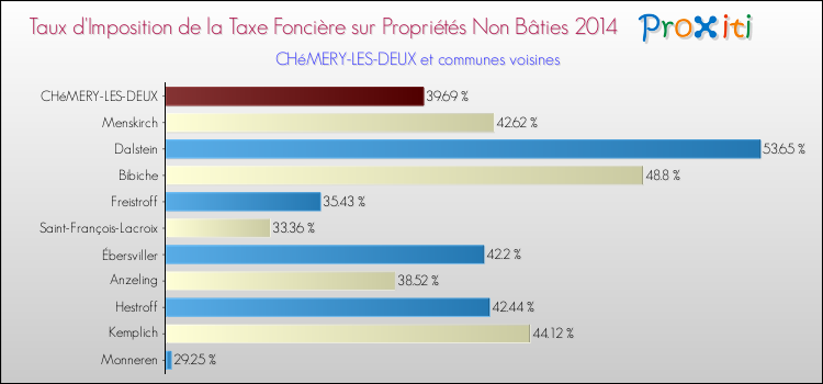 En 2014, le taux de la taxe foncière sur le non bâti vôté par le conseil municipal de Chémery-les-Deux était de : 39.69 %.