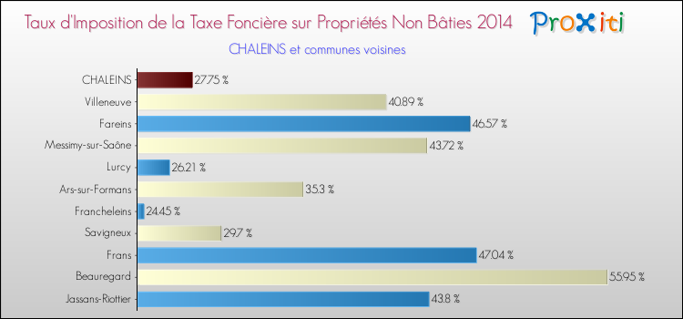 En 2014, le taux de la taxe foncière sur le non bâti vôté par le conseil municipal de Chaleins était de : 27.75 %.