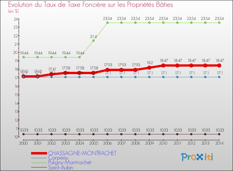 Pendant la même période, les communes françaises similaires à Chassagne-Montrachet, ont vu leur taux de taxe foncière sur le bâti augmenter de 10.76 % en moyenne entre 2000 et 2014.