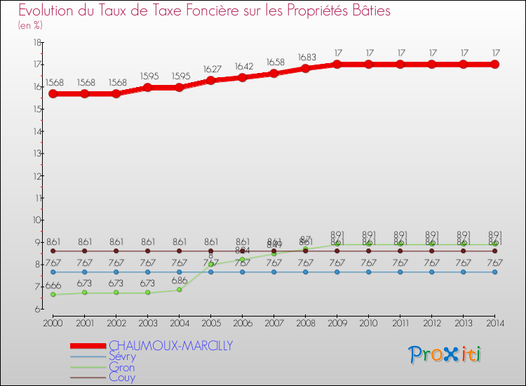 A Chaumoux-Marcilly, le taux de taxe foncière sur le bâti a donc augmenté de 8.42 % entre 2000 et 2014.