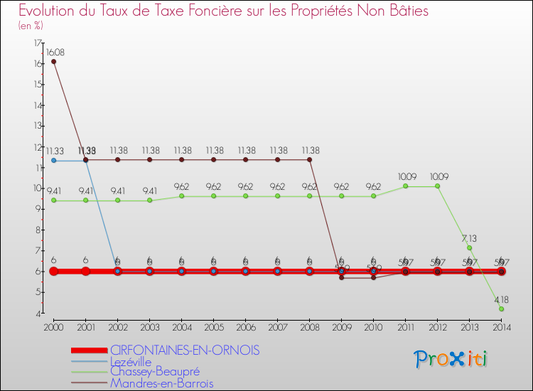 A Cirfontaines-en-Ornois, le taux de taxe foncière sur le non bâti a ainsi augmenté de 0 % entre 2000 et 2014.